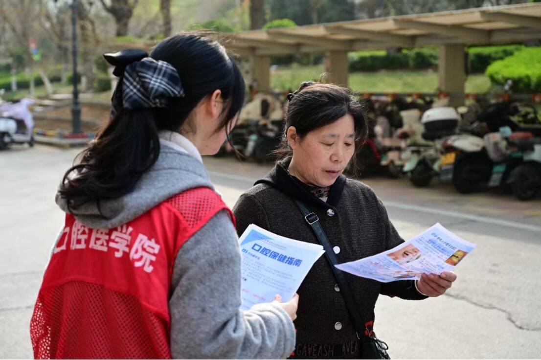 与此同时,志愿者们围绕“世界口腔健康日”主题,开展健康科普宣讲。以贴近生活的家庭小故事为切入点,生动讲解老年人口腔护理、儿童防龋护牙、巴氏刷牙法。针对视力不便的长辈,志愿者逐字朗读重点内容,确保健康知识“听得清、学得会、用得上”。