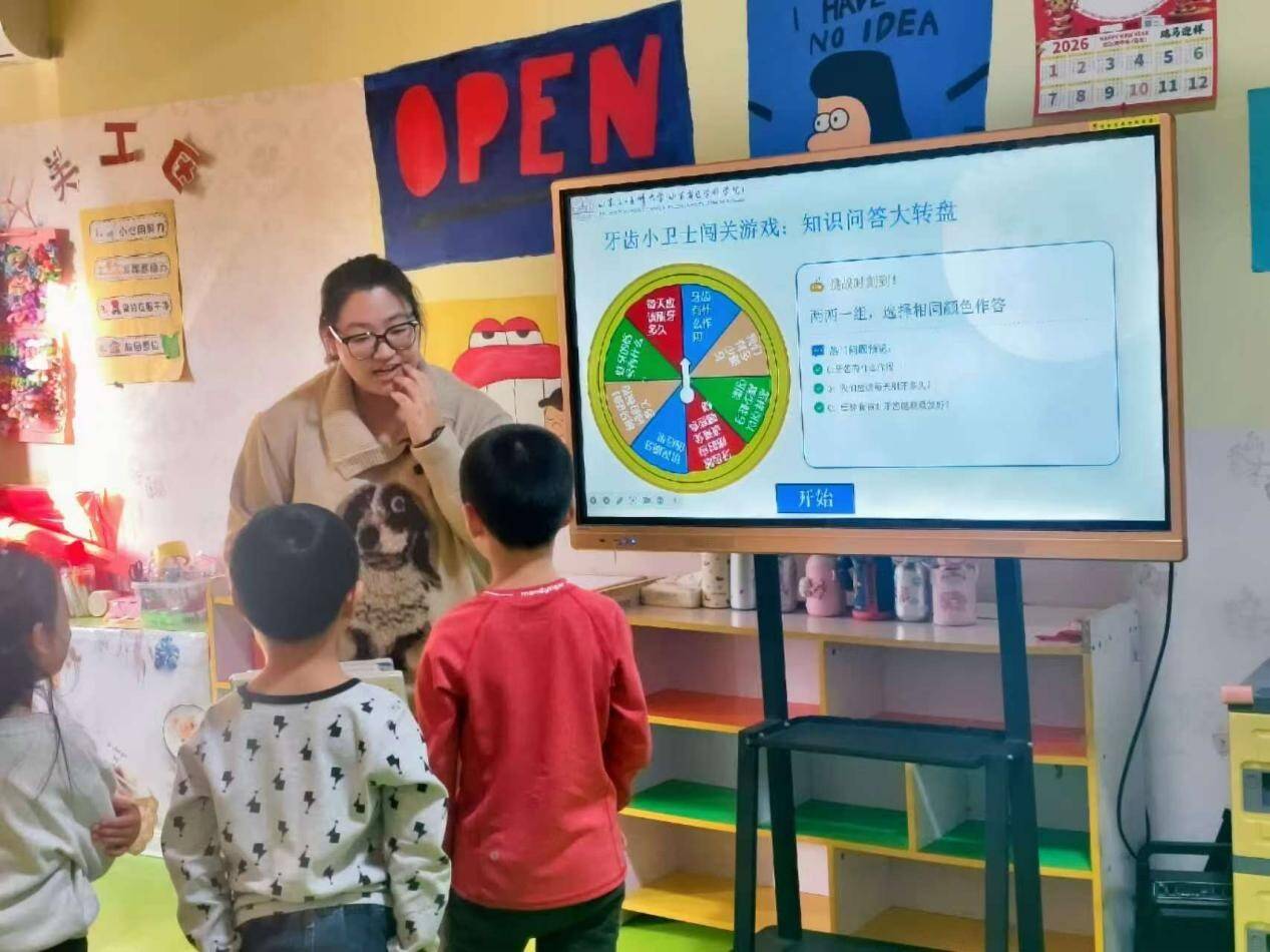 游戏热场后,志愿者们借朗朗上口的刷牙儿歌,结合亲自示范,细致讲解正确刷牙方法。随后开展 “牙齿知识大转盘” 互动,小朋友们全神贯注答题,答对获小奖品,答错则由志愿者耐心解惑,在玩乐中轻松掌握实用的牙齿保健知识。